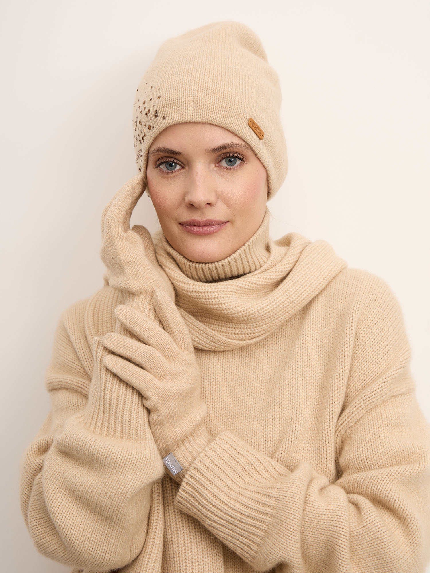 Шапка выполнена из мягкого кашемирового трикотажа, который приятно прилегает к коже, не вызывает раздражения и сохраняет тепло даже в ветреную погоду. Украшение из мелких страз у нижнего края создаёт лёгкий блеск, который красиво переливается на свету. Эластичная структура изделия обеспечивает комфортную посадку и идеальную форму.