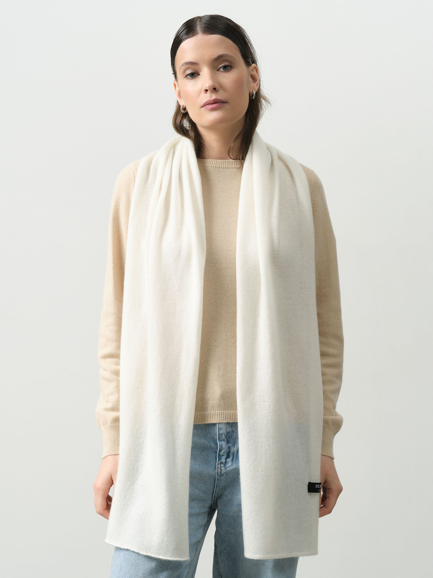 Шарф из 100% кашемира, очень мягкий и приятный на ощупь. Фото на сайте полностью соответствуют действительности. Белый цвет благородный, не желтит. |