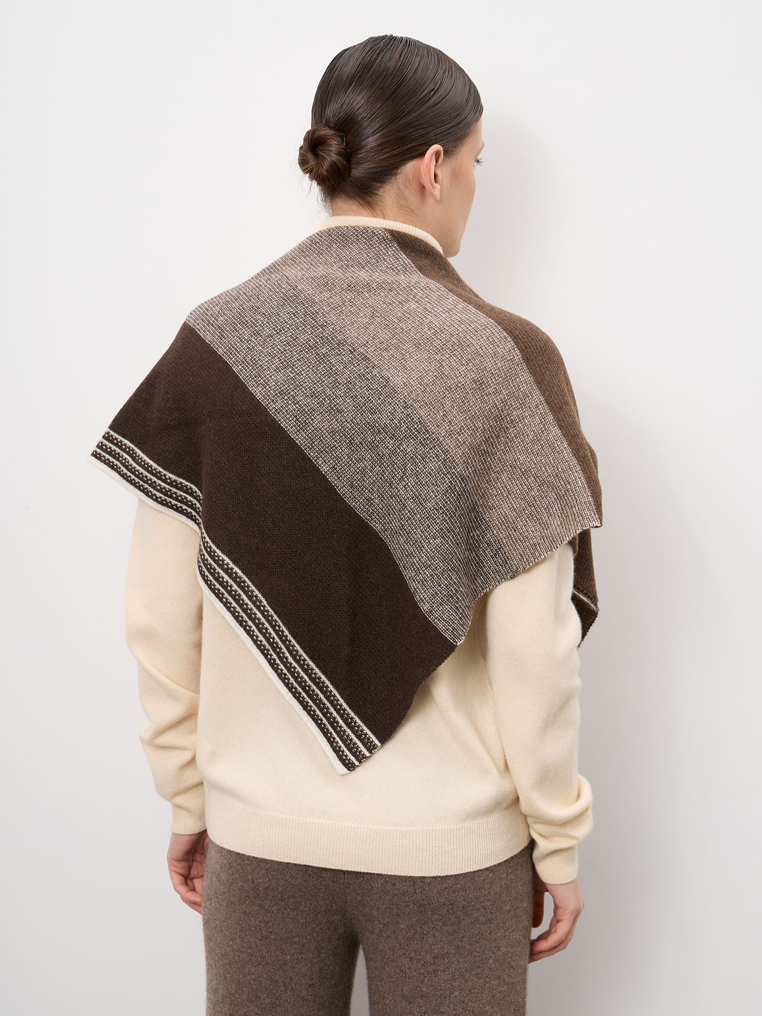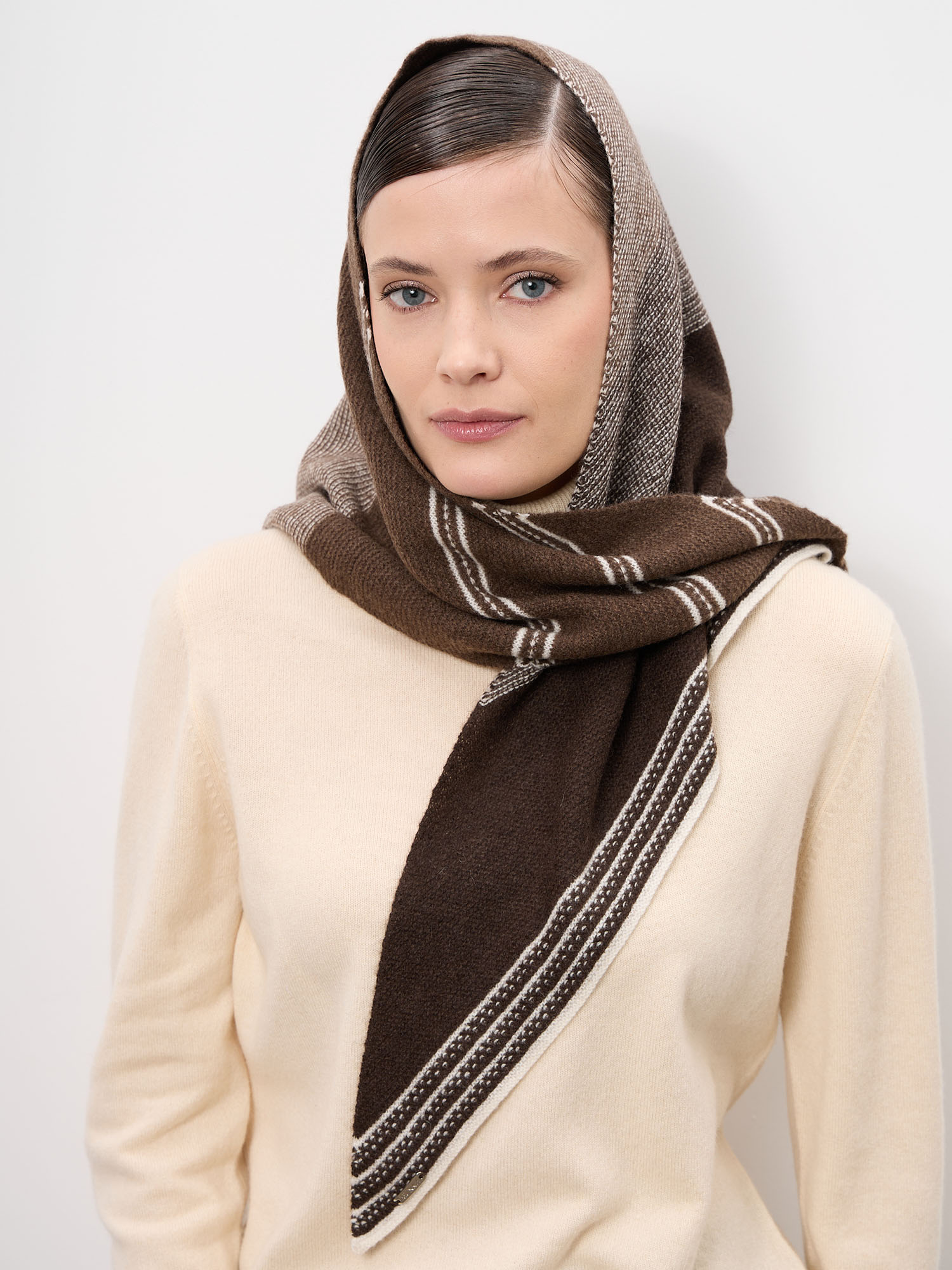Модель выполнена в лаконичном дизайне с аккуратной фактурной вязкой и декоративными полосами по краю. Форма платка позволяет носить его разными способами: как головной убор, на плечах или в качестве стильного акцента на шее.