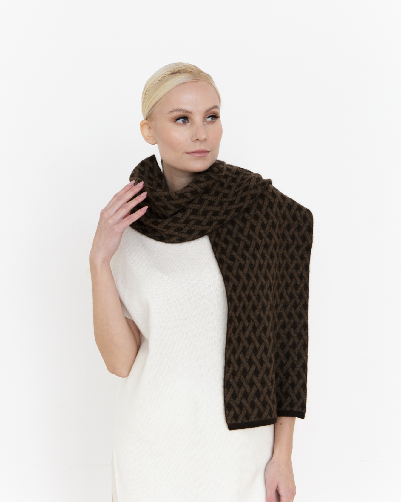 Темно-коричневый с контрастным бежевым узором — благородное сочетание натуральных оттенков, которое легко комбинируется с базовой палитрой гардероба.
