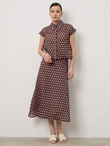 Лаконичный крой с короткими рукавами и аккуратной линией плеч. Классический принт в горошек придаёт модели выразительность и лёгкий ретро-характер. Блуза красиво сочетается с юбкой из той же ткани, создавая гармоничный комплект.