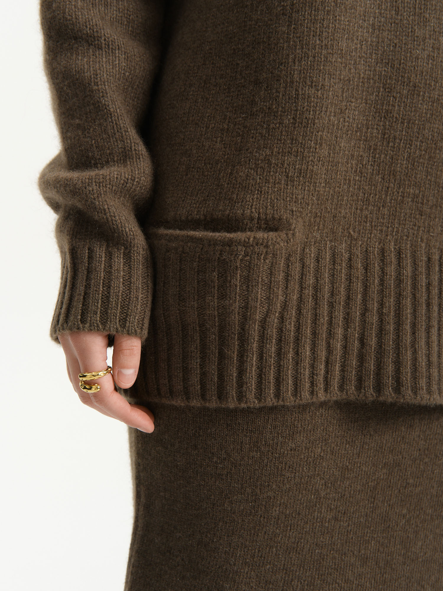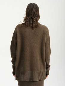 Модель выполнена с высоким воротником и классическим прямым силуэтом. Минималистичный дизайн подчёркивает натуральную красоту материала и делает свитер универсальным элементом базового гардероба.