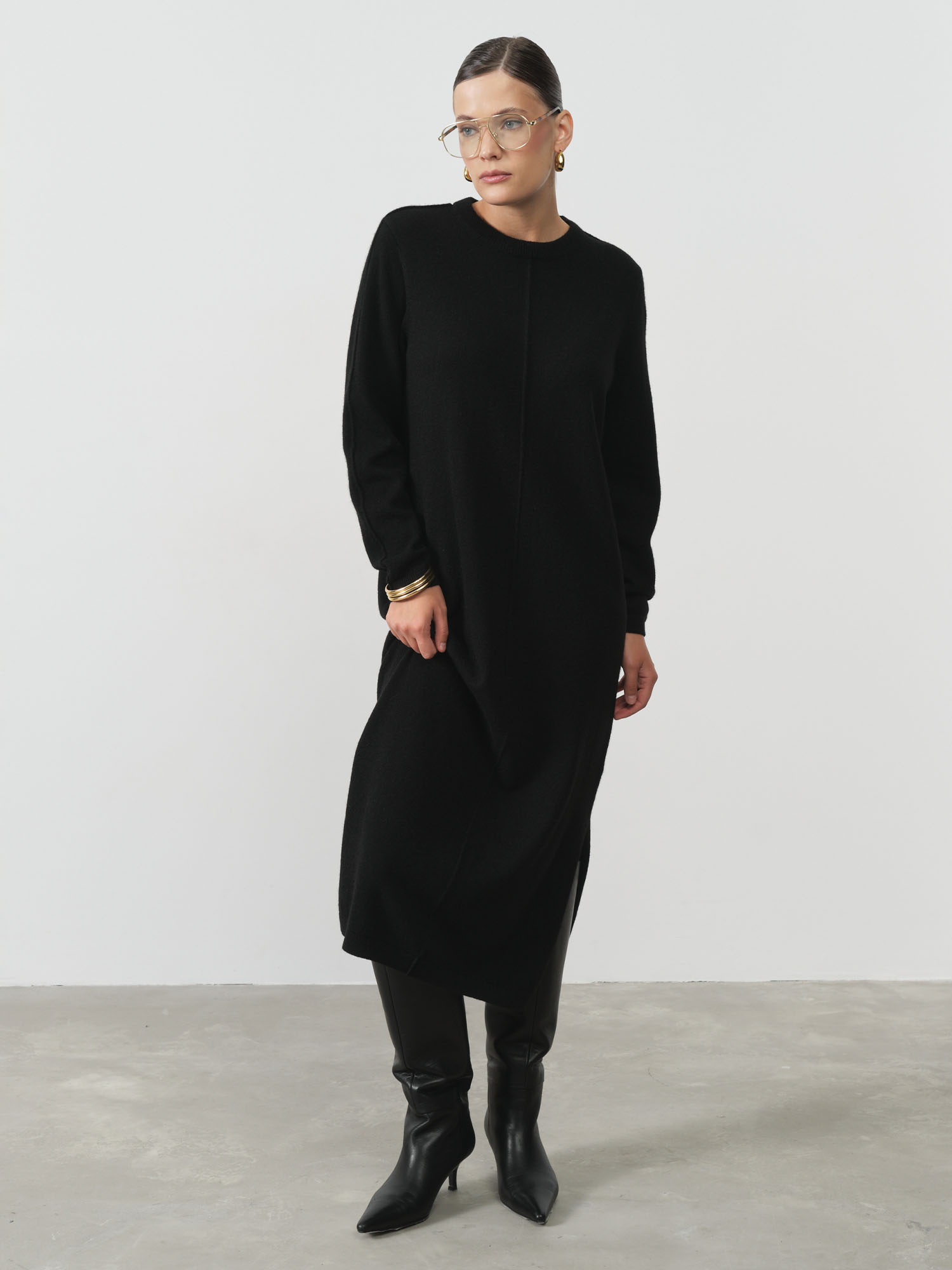 Модель выполнена в прямом силуэте с округлой горловиной и длинными рукавами. Лаконичный крой подчёркивает современный стиль и универсальность изделия.