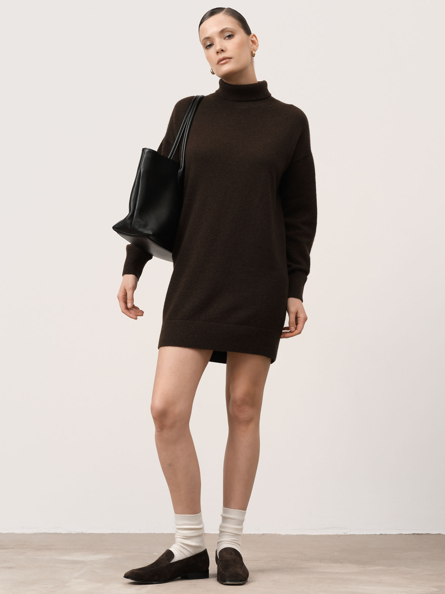 Платье из пуха яка — лаконичная и стильная модель, идеально подходящая для создания уютных и элегантных образов. Компактная длина и мягкая текстура делают его универсальным вариантом для повседневного гардероба.