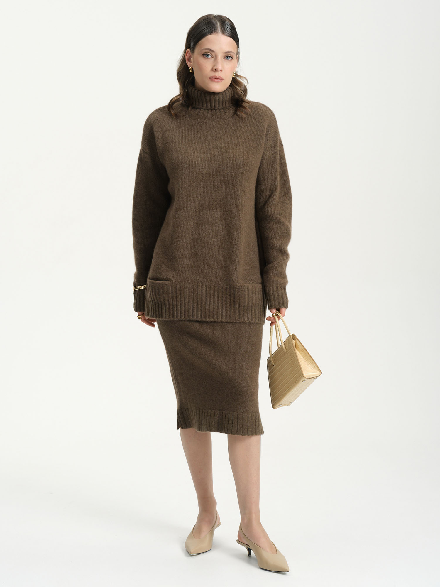 Юбка отлично сочетается с джемперами, водолазками и кардиганами. Подходит для повседневных и более элегантных образов. Гармонично смотрится с сапогами, ботильонами или классической обувью.